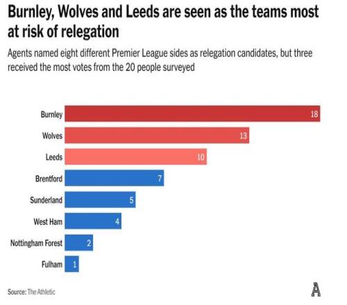 这也反映出狼队的负面情况,他们获得了第二高的降级票数(13票),仅次于伯恩利(18票)。“狼队现在太软弱了,而且他们失去了关键球员,”一位经纪人说。“那是一支会挣扎求存的阵容。”