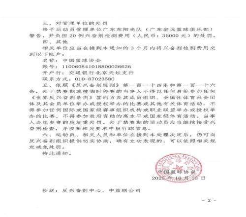 根据国家体育总局《反兴奋剂规则》的有关规定,中国篮协对吉伦沃特做出了禁赛3个月的处罚,禁赛期自2025年10月13日至2026年1月12日。此外,广东东阳光队(广东宏远篮球俱乐部)作为管理单位受到了警告及负担20例兴奋剂检测费用(人民币36000元)的处罚,该单位的医疗与反兴奋剂负责人、队医林志达被给予警告处罚。