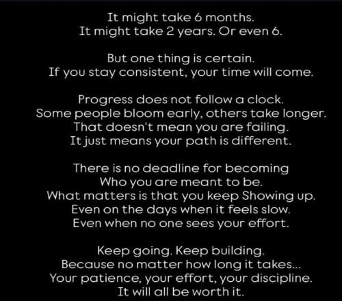 “要成为你注定会成为的那种人,这是没有时限的事。重要的是,你必须始终坚持展示自我,即使在感觉进展缓慢的日子里,即使是在没有人能看到你为此付出努力的时候……坚持前进!坚持建设!因为,无论需要多长时间,你的耐心、你的努力、你的自律,都会得到足够的回报!”