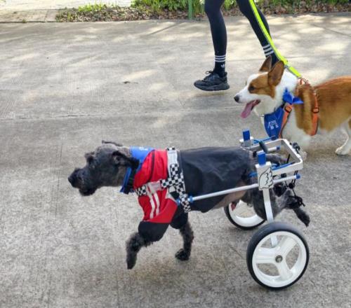 在人群中,有装着小轮车的残疾狗狗,也有正在康复训练中的导盲犬,还有被领养后第一次参加活动的流浪犬。