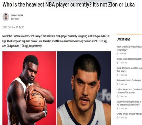 谁是NBA现役体重最大的球员?欧洲媒体BasketNews晒出TOP10名单,其中杨瀚森122公斤排第九,第一名高达138公斤。