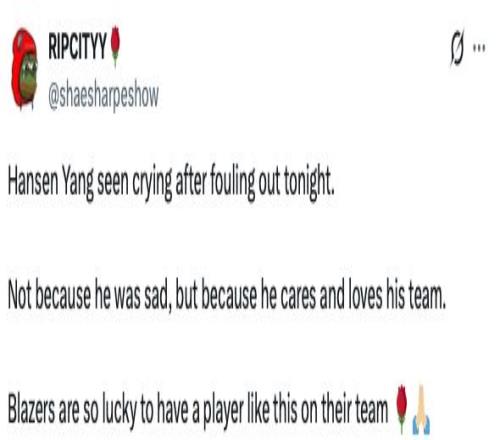 赛后,开拓者博主RIPCITYY发文:杨瀚森今晚因犯满离场而落泪。这并不是因为他难过,而是因为他在乎并热爱自己的球队。开拓者真幸运,能拥有这样一名球员在球队里。