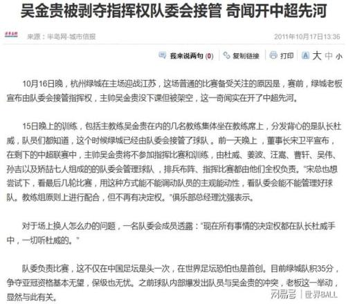- 半岛网-城市信报.吴金贵被剥夺指挥权队委会接管 奇闻开中超先河[Z/OL].搜狐体育.(2011.10.17).https://sports.sohu.com/20111017/n322435273.shtml.