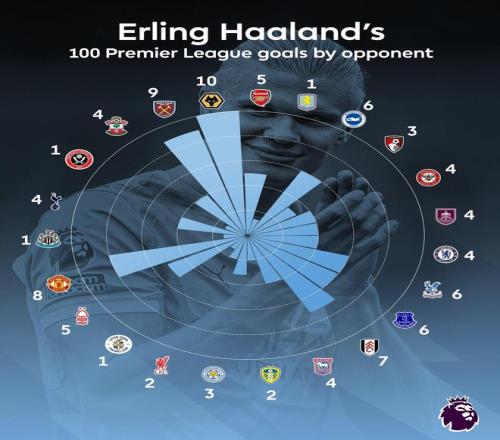 哈兰德100球攻破球门对手分布