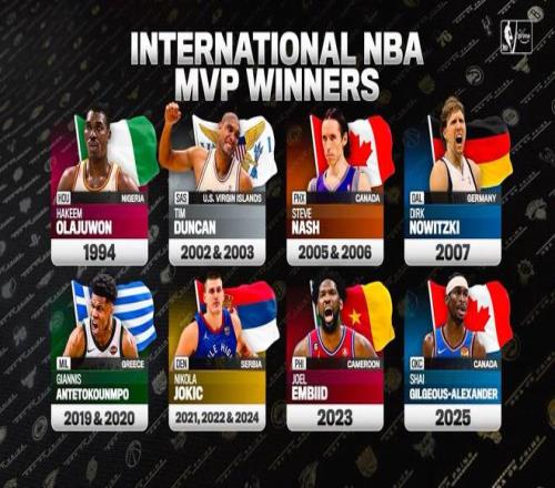 北京时间今日,在NBA直播期间,转播方晒出了NBA历史上所有的国际球员荣获常规赛MVP的名单,约基奇、字母哥等人悉数在列。