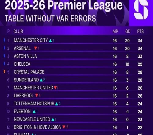 12月17日,数据机构Squawka统计了去掉有争议的VAR判罚的英超积分榜。如果没有VAR争议判罚,曼城将会反超阿森纳,上升到英超榜首的位置。去掉有争议的VAR判罚后的英超积分榜(球队/