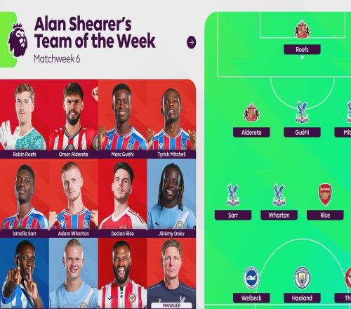 雷速体育9月30日宣 英超名宿阿兰·希勒为英超官方评选了第6轮比赛的最佳阵容。帮助水晶宫战胜利物浦的中场球员亚当·沃顿得到希勒极高评价,格拉斯纳成为周最佳主帅,哈兰德、