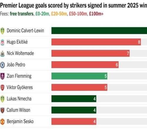 根据The Athletic的统计数据,在去年夏窗英超各队引进的中锋当中,勒温是在英超当中进球最多的,埃基蒂克排名第二,沃尔特马德第三。根据统计,去年夏天,英超俱乐部在中锋转会市场上依