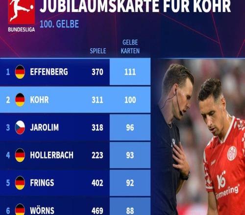 黄卡大师,美因茨后卫科尔是德甲历史上唯二染黄破百的球员