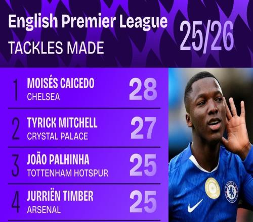 北京时间10月7日,知名数据机构Squawka统计出了本赛季英超前7轮过后抢断数排名前10的球员,切尔西的中场大将莫伊塞斯-凯塞多以28次排名第一,水晶宫的左后卫泰里克-米切尔以27次